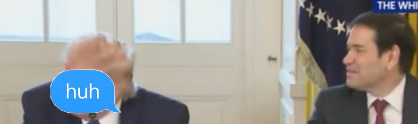 But that wasn’t the worst of it. At one point, Secretary of State and awful accomplice Marco Rubio handed Trump what was meant to be a private note. Without hesitation, Trump announced: “Marco just gave me a note—‘Go back to Chevron, they want to discuss something.’ Go ahead, I’m going back to Chevron. Thank you, Marco.”