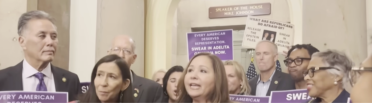 On Tuesday, a group of Democratic lawmakers marched to Speaker Mike Johnson’s office, chanting: “Swear her in!” Johnson is still stalling the swearing-in of Rep.-Elect Adelita Grijalva—who will trigger a vote on releasing the Epstein files once seated.