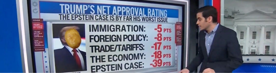 Trump’s polling numbers are underwater on a number of issues. But none are as bad as his handling of the Epstein case, which sits at a -39 net approval. It’s a jaw dropping number, even for Trump. Maybe he should just release the files already.