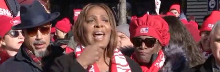 NY AG Letitia James also spoke, declaring: “If these hospitals have money to hire scabs, then they’ve got money and resources to address the needs of these nurses.”