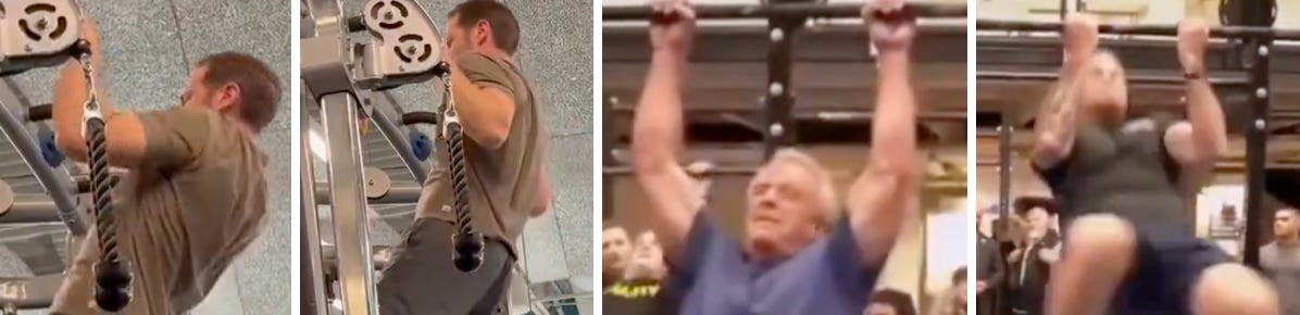 Dem Rep. Jason Crow is a retired Army Ranger who served in Iraq and Afghanistan, who still works out all the time. When he saw Bob Kennedy and Pete Hegseth doing sloppy pull-ups, he decided to show them how it’s actually done. Crow can be seen above in the two images on the left. Kennedy and Hegseth are on the right.