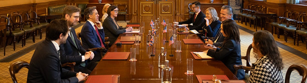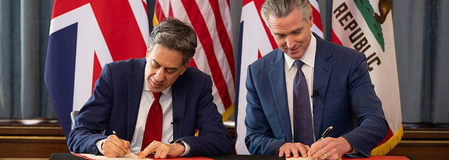 Newsom and the UK Energy Secretary signed a memorandum of understanding on clean energy—offshore wind, carbon removal, and research partnerships to increase cooperation and investment between California and the UK.