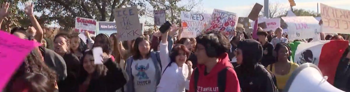 In Austin, students marched from City Hall to the Texas Capitol, chanting against ICE and demanding accountability for the killings of Renee Good and Alex Pretti in Minneapolis. Similar protests took place recently in Dallas, Fort Worth, Pflugerville, Waco, and beyond.