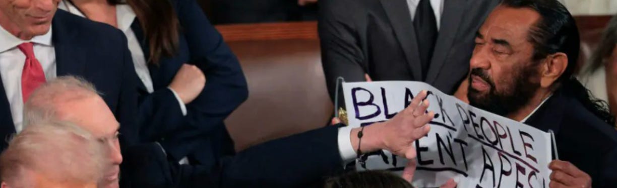 When Trump walked in, Dem Rep. Al Green held up a sign: “Black People Aren’t Apes!” A direct response to the racist video Trump shared which depicted Barack and Michelle as just that. The Sergeant at Arms moved in as multiple Republicans grabbed for the sign. But Green held on, waving it as he was escorted out.