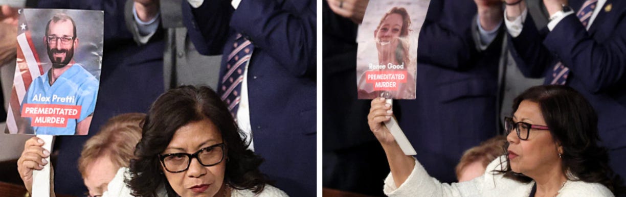 Dem Rep. Norma Torres held up photos of Renee Good and Alex Pretti—two Americans killed by the regime’s rogue agents—as Trump lied about crime.