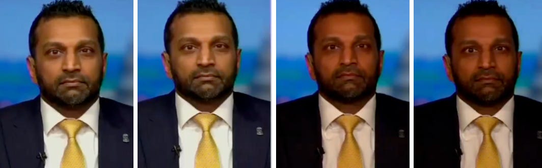 While spreading propaganda via Fox “News” yesterday, FBI Director Kash Patel’s lighting seemed to shift on him momentarily—as seen in the images above. He was visibly distracted as someone in the background could be heard complaining about the issue.