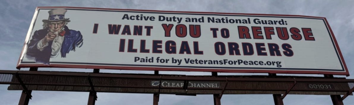Veterans For Peace put up a billboard in Tucson, Arizona, to amplify a message from Sen. Mark Kelly and other Vets in Congress who released a video urging troops not to follow illegal orders. The billboard reads: “Active Duty and National Guard: I want you to refuse illegal orders,” with a picture of Uncle Sam on the side.