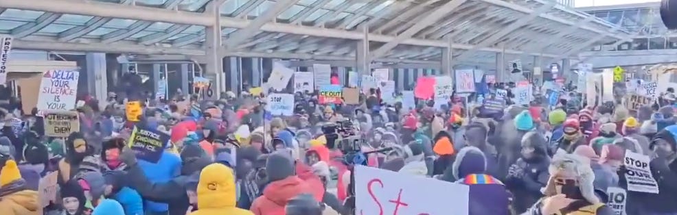 In Minneapolis, countless businesses closed their doors in solidarity as protesters gathered outside the local ICE building. And at Minneapolis-Saint Paul International Airport, religious leaders led a massive demonstration that filled the outside of the departures terminal.