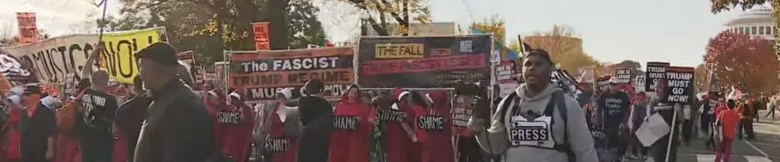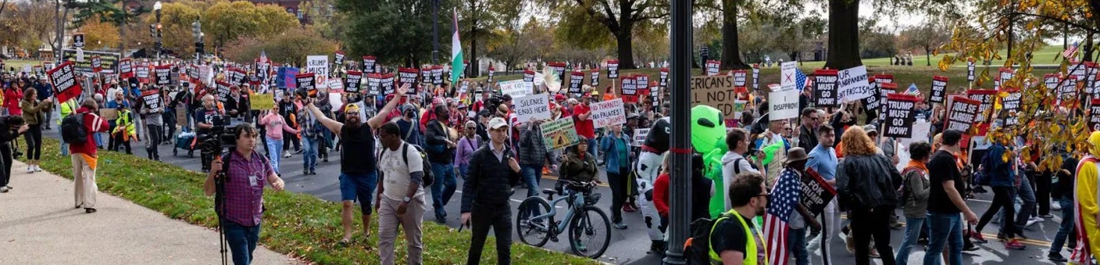 Anti-Trump protests have been held daily in Washington, DC this week, including a large, fired-up rally on Wednesday. It took place a day after Dems swept races across the country—and exactly one year since the 2024 Election. Folks came out to march in droves, holding signs that read “Shame” and “No Tyrants No Palaces No Trump.”