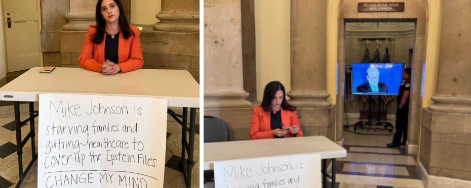 Recreating one of the internet’s most famous memes, Dem Rep. Yassamin Ansari set up a table outside of Mike Johnson’s office, with a sign that read: “Mike Johnson is starving families and gutting healthcare to cover up the Epstein Files. CHANGE MY MIND.”