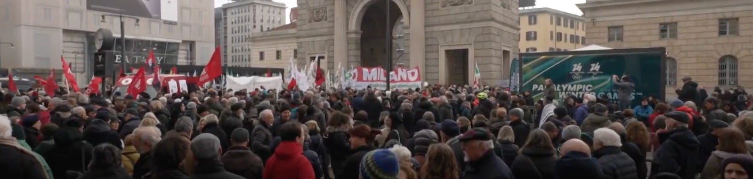 The Winter Olympics kick off this week in Italy—and residents are furious that Trump says he’s sending ICE to the games. On Saturday, a large crowd gathered in Milan to protest ICE at Piazza XXV Aprile—a square that pays homage to the city’s liberation from the nazis. Fitting.