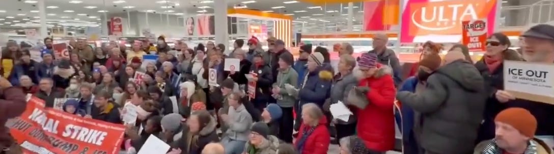 ICE has been staging some of its operations in Target parking lots in the Minneapolis-Saint Paul area, so folks were demanding an end to that. Some signs read: “Target, support your community not ICE abuse” and “Shut down Target to kick ICE out.”