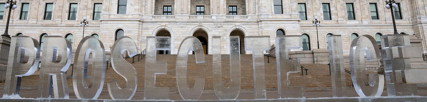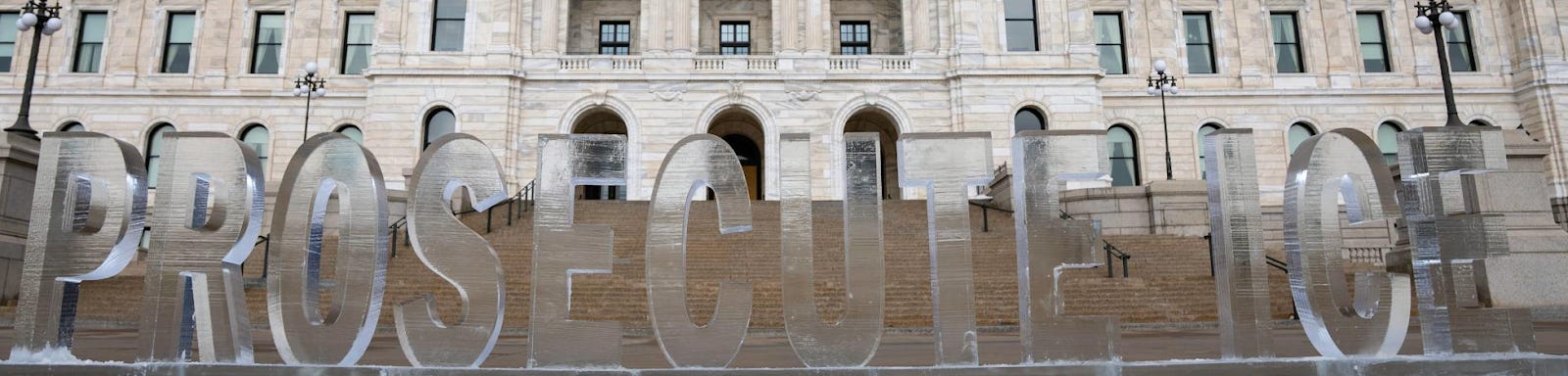 An ice sculpture reading “PROSECUTE ICE” was installed outside the Minnesota State Capitol. Pardoned Jan 6 insurrectionist Jake Lang was thrown behind bars after posting a video of himself damaging it.
