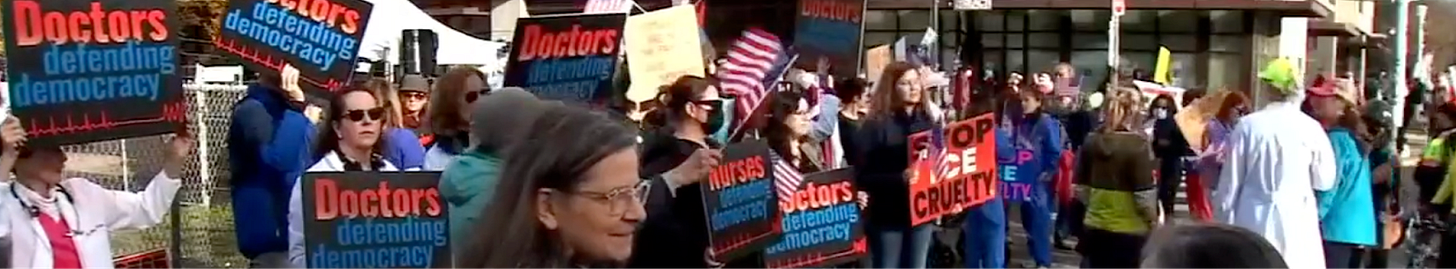Organized by the group Doctors Defending Democracy, many folks wore scrubs and white coats while carrying signs that read: “When injustice becomes law, resistance becomes duty!” and “Stop ICE Cruelty.”
