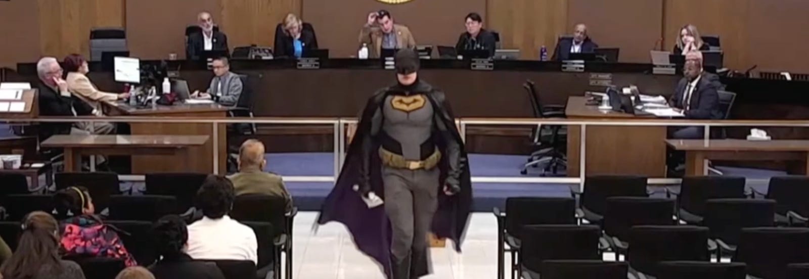 A man showed up to a recent Santa Clara City Council meeting in a Batman costume. He roasted local leaders for failing to protect residents from ICE ahead of the Super Bowl, which will be hosted in the city. He said: “You have had months to prepare,” adding: “I don’t give a damn if this is out of decorum.”