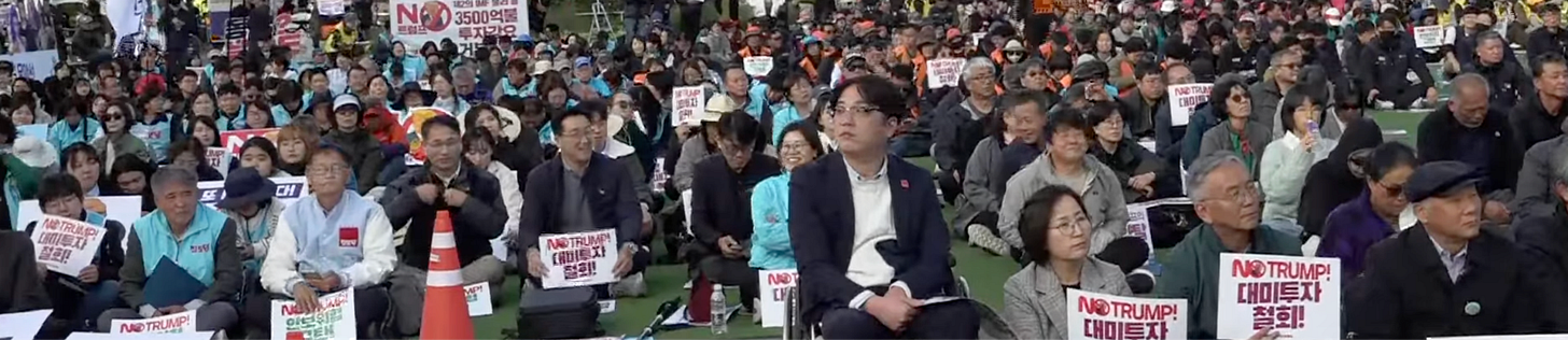 Another round of anti-Trump protests erupted in Gyeongju, South Korea on Wednesday, as part of a multi-day pushback against his unhinged tariffs. Folks walked toward the venue where Trump was scheduled to meet with the President of China on Thursday, chanting “No Kings: Trump Not Welcome.”