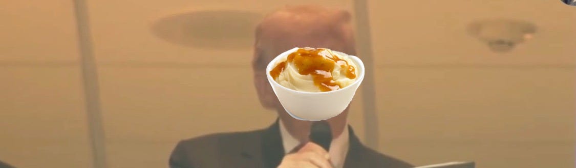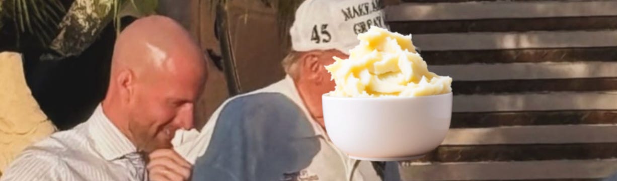Trump’s getting slammed hard for leaving DC this weekend to golf and throw another lavish gala at his Mar-a-Lago bunker. And yes, that’s a bowl of mashed potatoes covering his face in the image above.