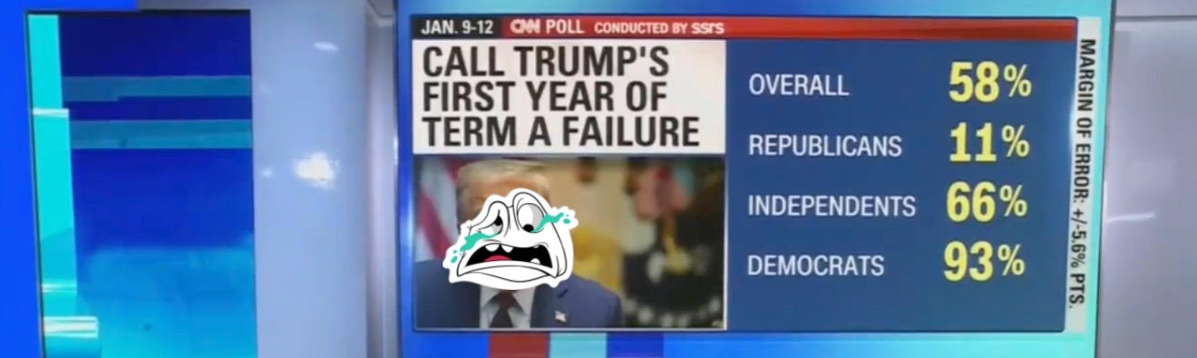 A new CNN poll revealed that 58% of Americans call Trump’s first year a “failure.” Among those surveyed, only 19% “approve strongly” of his job performance, the lowest ever for Trump out of the 21 polls taken since early 2017.